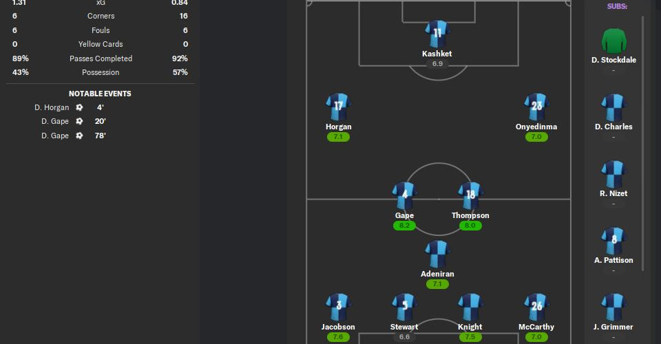The team had their day off taken away from them after the performance to really fire a rocket up them. We focused on our team work and our tactical awareness. It payed off MASSIVELY with a impressive 3-0 win over Huddersfield at home.